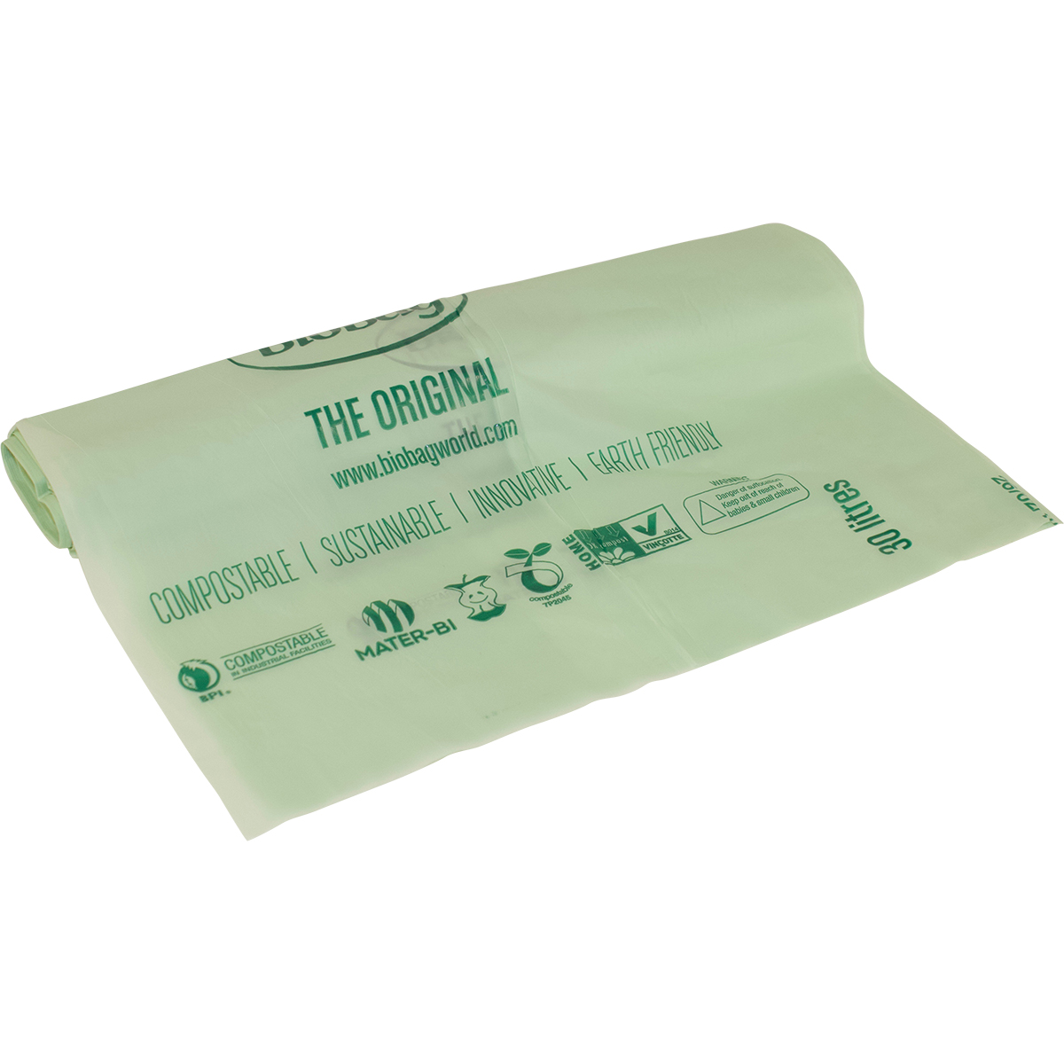 BioBag bags and films are home compostable. Made from Mater-Bi – a starch-based bioplastic incorporating vegetable oils, cellulose, biodegradable polymers, and natural plasticisers. All crops are cultivated using sustainable farming practices and contain no palm oil or GMO ingredients.
