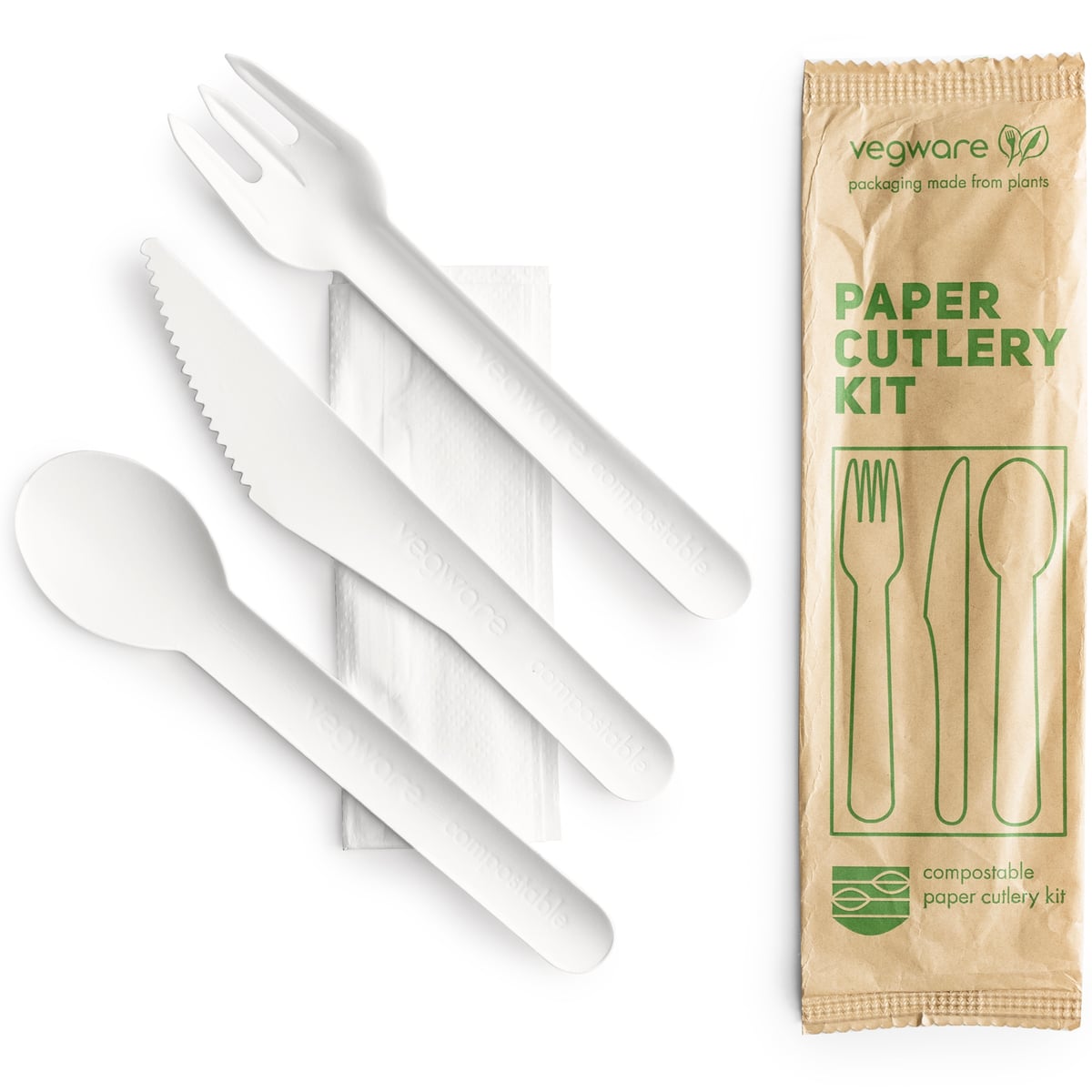 Cutlery Set Paper 16cm knife, fork, spoon & white napkin in kraft paper wrap