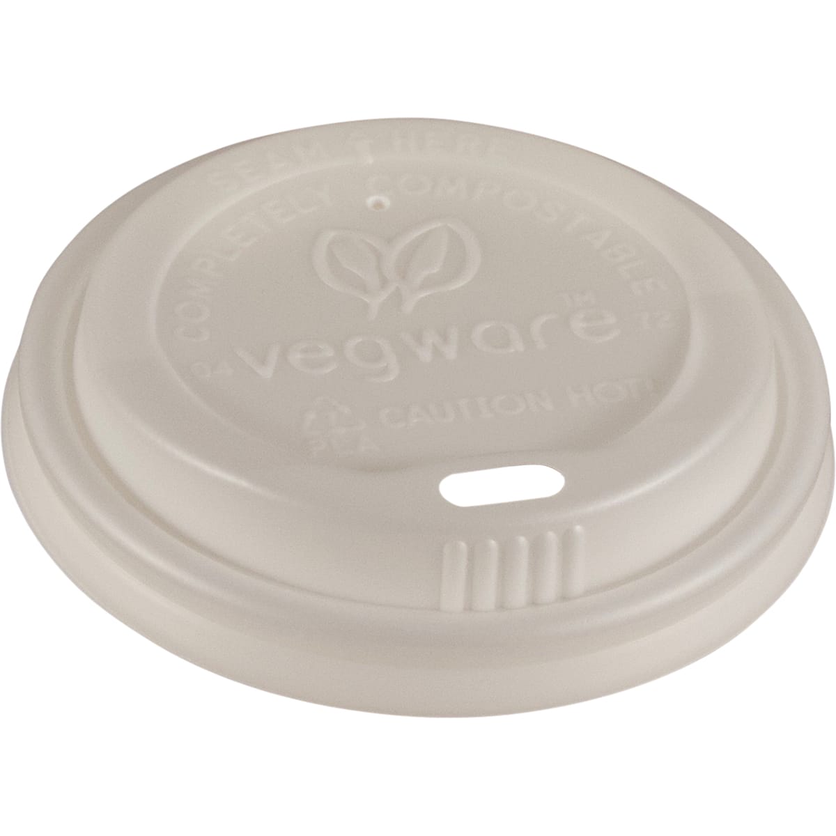 These hot cup lids are made from CPLA. PLA is an amazing new material, so more information has been summarised on the FAQ (Frequently Asked Questions) page. They have been crystallised (CPLA) to create heat resistance for hot drinks, giving a white, opaque finish – award-winning quality and B CORP™ Certified by Vegware.